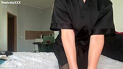 Flexible lady in satin lingerie works as a hot maid in nylon at the hotel