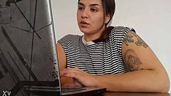Bossdam Kit Mercer Retar Med Stora Tuttrar Över Skrivbordet Hårdporr