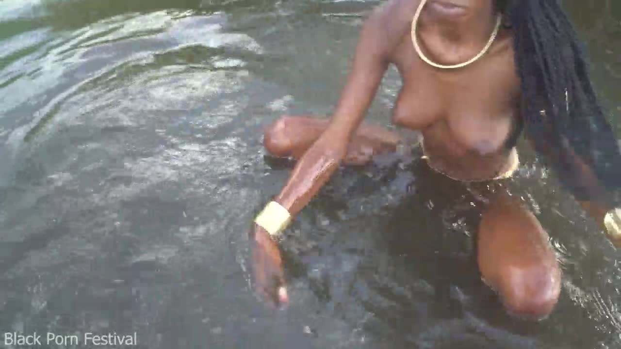 Атрактивна африканска девойка с тънка талия се къпе на открито в река на ранчо
